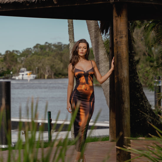 The Deian Sculpted Maxi Dress is designed around a striking body print that enhances the natural lines of the figure. Carefully placed contour lines create depth through the print, shaping the waist and highlighting curves while visually elongating the silhouette.